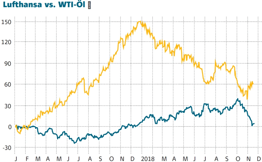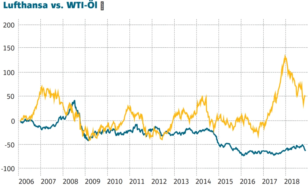 Es wurde immer wieder erklärt: Steigt der Ölpreis, so fällt die Aktie der Lufthansa. Schließlich sind Treibstoffkosten ein wichtiger Faktor für die Airline. Doch vom jüngsten Ölpreisrutsch um rund 30 Prozent profitierte der DAX-Titel kaum. Was verständlich ist, wenn man auf die bisherige Korrelation blickt.