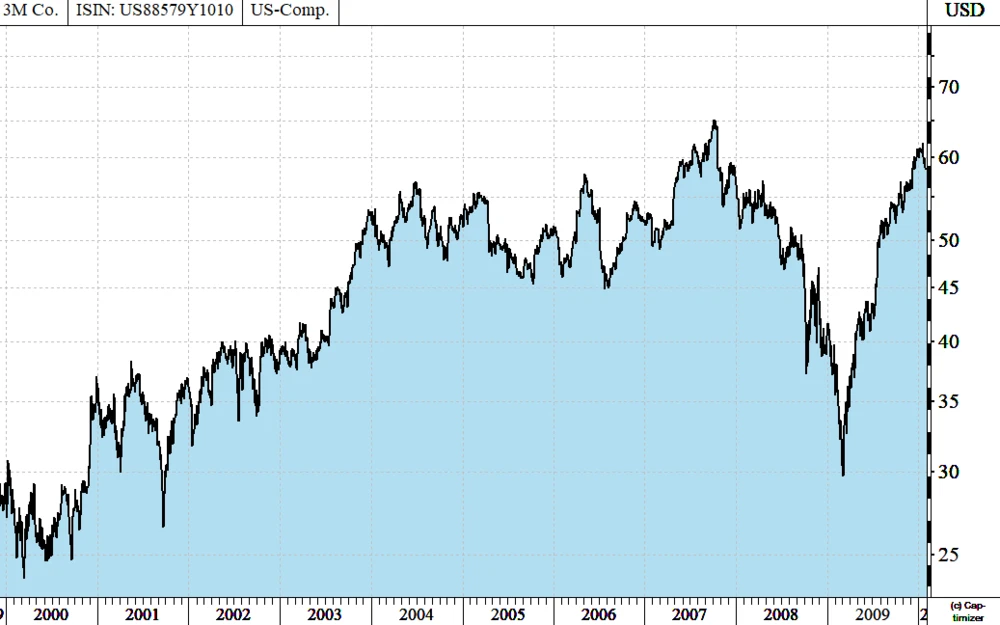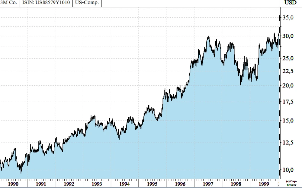 Betrachten wir die Aktie von 3M. Wenn man Anfang 1990 auf den Chart der Aktie geblickt hätte, hätte man folgendes Bild vorgefunden: