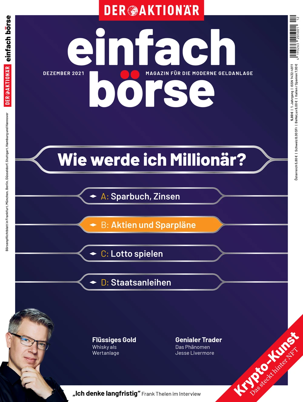 Doch um sich als Millionär bezeichnen zu können, bedarf es einer klaren Strategie und dieser drei Faktoren: Zeit, Zins und Zaster. Wie Sie diese Faktoren gewinnbringend einsetzen und wie Sie Ihren ganz persönlichen Weg zu einer Million Euro beschreiten, erfahren Sie im Schwerpunkt der neuen Ausgabe 12/21 von einfach börse.