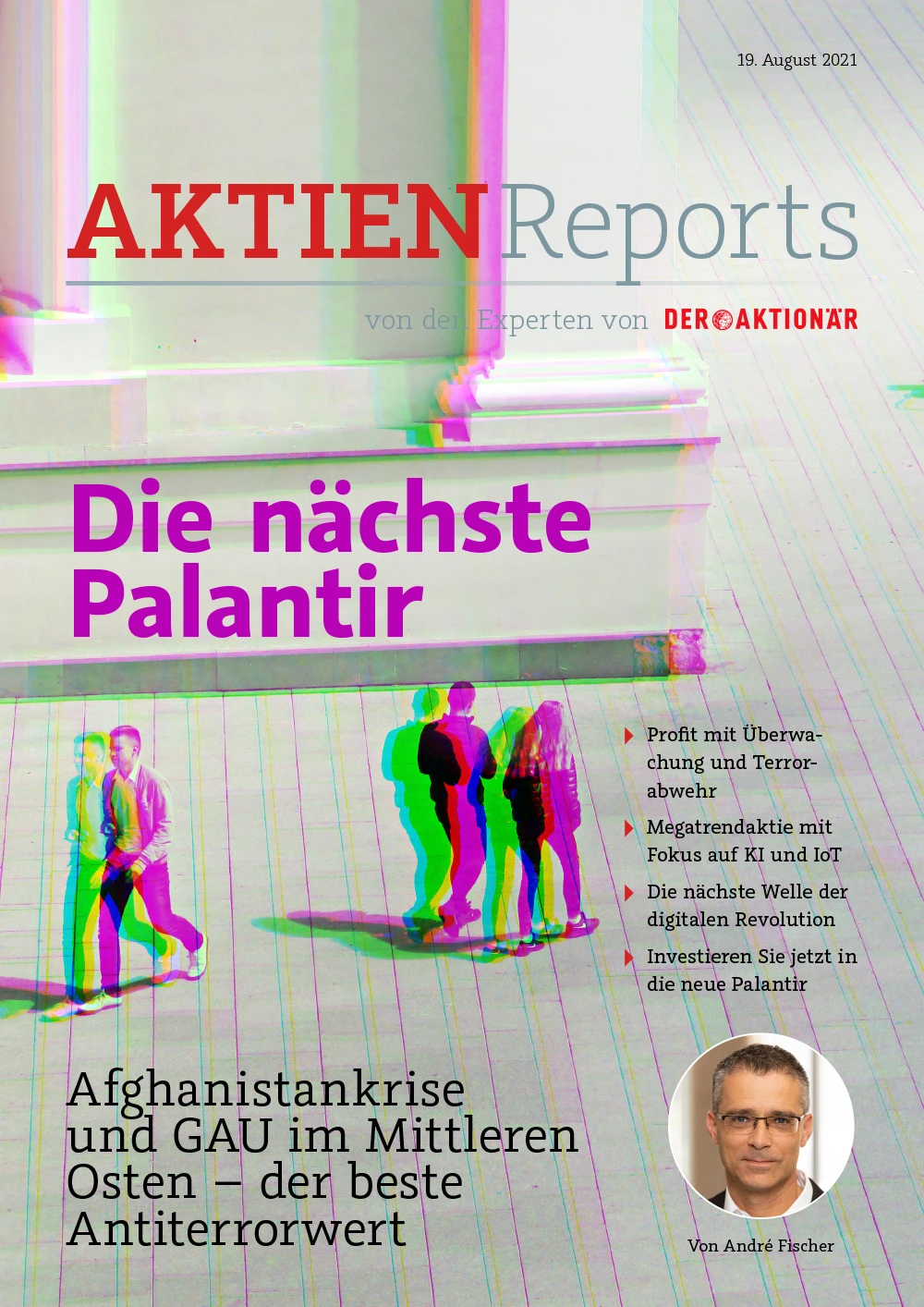 Im neuen 8-seitigen Fischer-Report ist zu lesen, wie namhafte Experten im Zuge der Afghanistankrise vor einer neuen gefährlichen Terrorwelle warnen. Wenn Sie wissen wollen, bei welchem Antiterror-Spezialisten das Geschäft neuerdings an allen Fronten explodiert, empfiehlt sich jetzt die Lektüre des Aktienreports „Die nächste Palantir“.