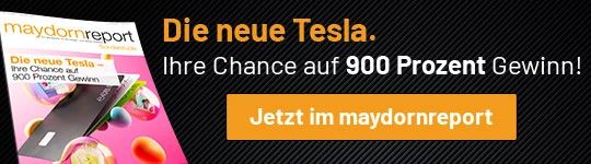 Maydorns vielversprechende Neuentdeckung mit Verzehnfacher-Potenzial wird ausführlich in einer Sonderstudie speziell für die Leserschaft des maydornreport vorgestellt. Außerdem erhalten Sie zusätzlich eine Empfehlung für ein passendes Top-Hebelprodukt auf die Aktie – für alle, die ein Maximum an Rendite herausholen wollen. Seien auch Sie den Zukunftstrends auf der Spur und sichern Sie sich Ihre Chance auf die neue Tesla! Der maydornreport macht´s möglich.