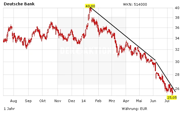 Sehen Sie, ich halte die Deutsche Bank für eine Schlüsselaktie im DAX. Damit meine ich nicht die Performance, sondern die Bedeutung der Deutschen Bank für den Finanzplatz Deutschland und die deutsche Konjunktur. Jain und Fitschen schaffen es bislang nicht, dem Markt klarzumachen, welche Strategie sie verfolgen. Womöglich haben sie keine richtige Strategie. Und wenn man sich den Aktienkurs anschaut, glaubt der Markt offenbar auch nicht daran, dass Fitschen und Jain in den kommenden Monaten eine überzeugende Strategie vorlegen werden.