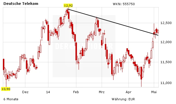 Die Papiere der Deutschen Telekom haben zuletzt Gas gegeben. Die DAX-Titel ist über die 12-Euro-Marke ausgebrochen und damit den Abwärtstrend der vergangenen Wochen hinter sich gelassen, der Weg bis zum alten Jahreshoch bei 12,92 Euro ist frei. Spekulationen um ein Gebot für die Tochter T-Mobile US hatte das Interesse der Marktteilnehmer für die Telekom-Aktie angeheizt. Bietet Sprint für T-Mobile US, klingeln bei der Konzernmutter Telekom die Kassen. Die Zahlen sollten im Rahmen der Erwartungen ausfallen. Investierte Anleger bleiben dabei und sichern ihre Position mit einem Stopp bei 10,40 Euro ab. Das Kursziel lautet nach wie vor 14,00 Euro.