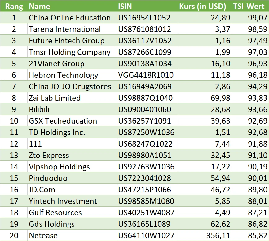 Die folgende Liste zeigt die Top 20 der China-Aktien sortiert nach TSI-Wert („Trend-Signale-Indikator“). Der Indikator berechnet für jedes Unternehmen dessen Trendstärke im Verhältnis zu allen anderen Titeln. Die stärksten Werte erhalten den höchsten TSI-Score, der zwischen 100 (maximale Trendstärke) und 0 (minimale Trendstärke) liegen kann. In typischen TSI-Strategien sind Scores jenseits der 90 Kaufkandidaten.