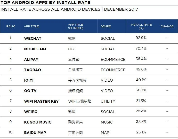 Bei den sozialen Netzwerken hat ganz klar Tencent die Nase vorn. Der Messenger QQ und die Multifunktionsapp WeChat sind auf den meisten Android-Geräten installiert. Um sich die schiere Masse der Nutzer von WeChat vor Augen zu halten: Im November waren es 980 Millionen täglich aktive Nutzer – das sind 70 Prozent der chinesischen Bevölkerung.