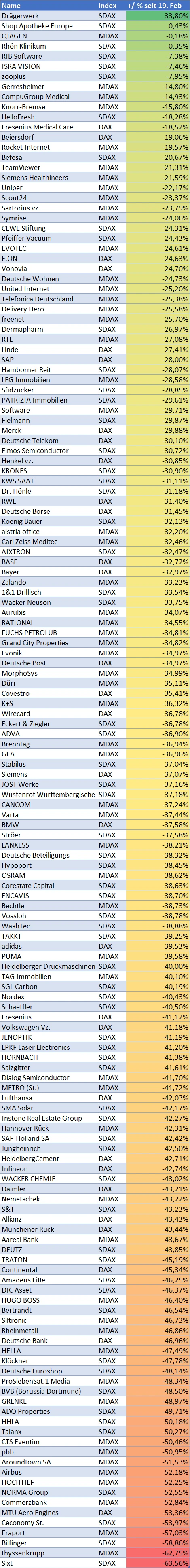 Der vollständigen Liste des HDAX & SDAX können Sie die Ergebnisse Ihrer Depotwerte seit dem 19. Februar entnehmen:
