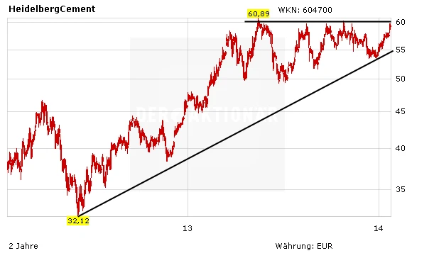 Für Unterstützung beim Ausbruch über die 60-Euro-Marke sorgen positive Analystenstimmen. Die Citigroup bestätigte die Kaufempfehlung für den DAX-Titel mit einem Kursziel von 62,00 Euro. Nach einem enttäuschenden Jahr 2013 für den Baustoffsektor rechnet Analyst Aynsley Lammin mit einer Erholung in 2014. Noch optimistischer ist die französische Investmentbank BNP Paribas. Yassine Touahri stufte HeidelbergCement von „Neutral“ auf „Outperform“ nach oben und erhöhte das Kursziel von 54,00 auf 75,00 Euro. Auch Touahri geht von einer besseren Marktlage im laufenden Jahr aus.