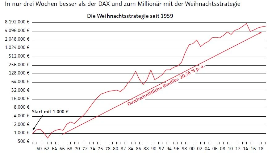 Denn statistisch betrachtet ist die Zeit rund um Weihnachten und Neujahr die beste Börsenzeit des Jahres. Noch besser sieht es in Hausse-Jahren aus. Denn gute Aktienjahre enden in der Regel überdurchschnittlich stark. Mit Hilfe der Weihnachtsstrategie können Sie diesen saisonalen Effekt auf einfache Weise für sich nutzen. Die richtige Strategie und ein passendes Derivat machen es möglich, dass sich seit 1959 jährlich Renditen von durchschnittlich 20 Prozent erzielen lassen – innerhalb von nur rund drei Wochen! Das ist deutlich mehr, als der DAX im ganzen Jahr erreicht.