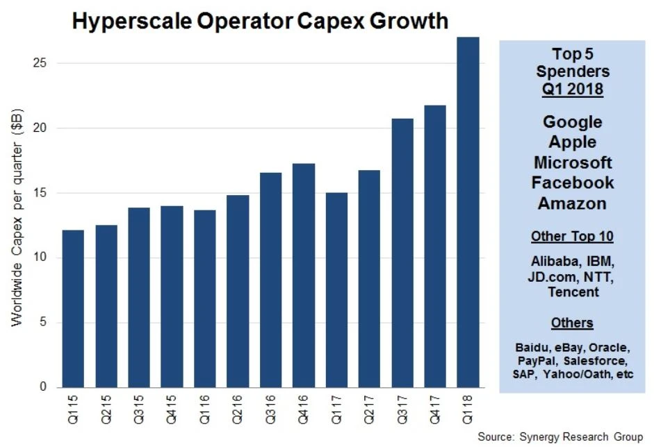Die Outperformance der Aktien von Alphabet, Microsoft und Amazon ist bekannt. Doch auch die Hersteller profitieren – denn die Anbieter investieren massiv in den Ausbau ihrer Infrastruktur. Laut Synergy Research stiegen die Investitionsausgaben der Hyperscale-Anbieter im ersten Quartal auf 27 Milliarden Dollar.