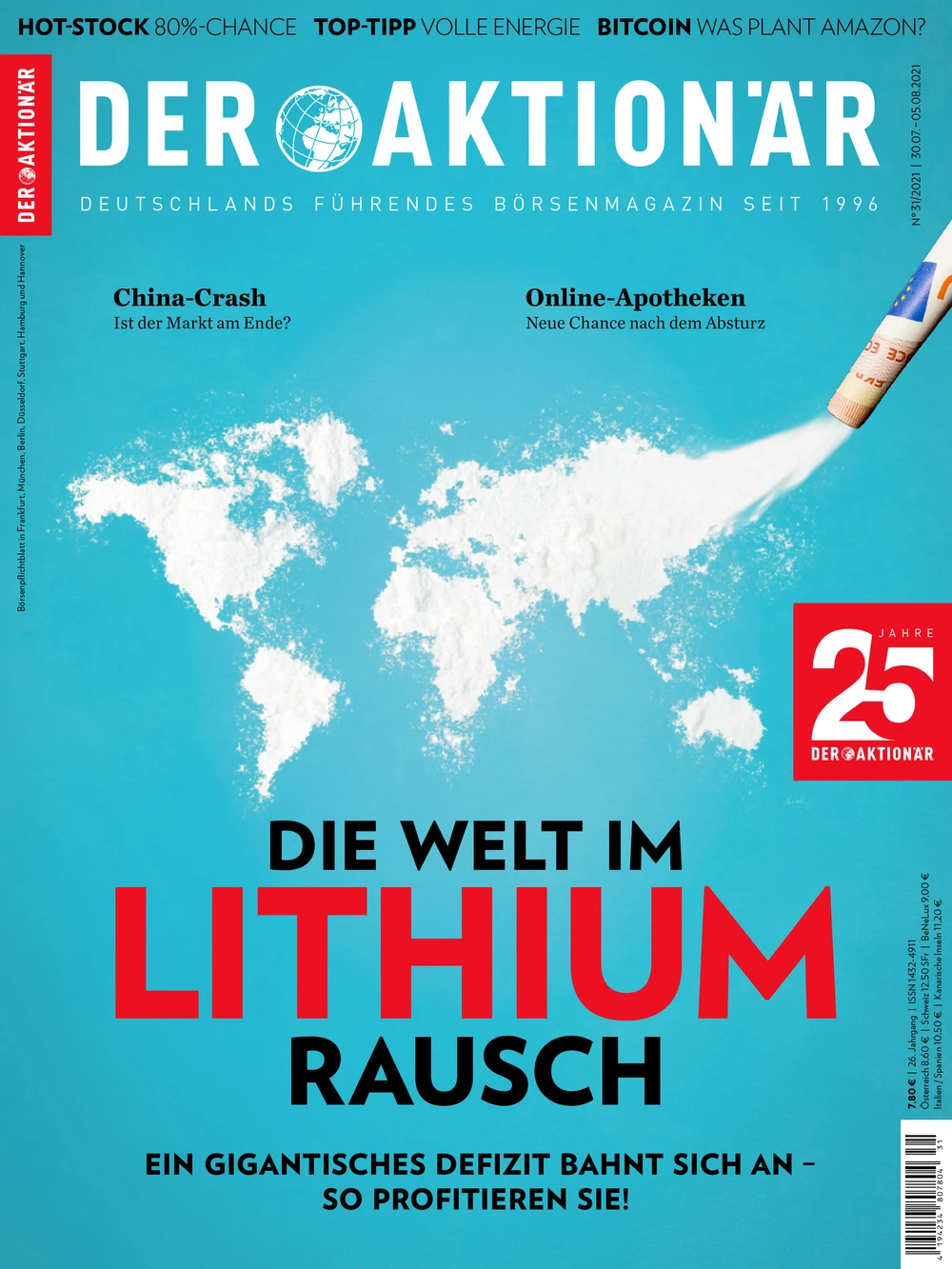 Sollte dieses Tempo beibehalten werden, könnte sich schon bald ein gigantisches Defizit anbahnen – denn eines der wichtigsten Bestandteile der Batterien für E-Autos ist Lithium. Das Leichtmetall kommt zwar weltweit vor, doch es könnte Jahre dauern, bis die Branche die sprunghaft gestiegene Nachfrage bedienen kann. Die Folge: weiter steigende Lithiumpreise. Welche Produzenten sind hier am aussichtsreichsten positioniert? Und auf welche Aktien sollten Sie jetzt setzen? DER AKTIONÄR gibt Ihnen in der neuen Ausgabe 31/21 die passenden Antworten darauf.