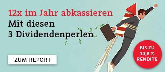 Herausgekommen sind nicht nur 3 Top-Aktien, die aus charttechnischer Sicht erhebliches Gewinnpotenzial mitbringen, sondern auch bis zu 10,8 Prozent Dividendenrendite ausschütten. Mehr zu diesen 3 Top-Titeln, mit denen Sie 12-mal im Jahr Kasse machen, erfahren Sie jetzt exklusiv im neuen Aktien-Report „Dickes Dividenden-Depot“.