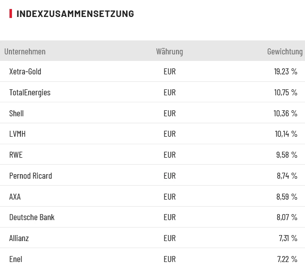 In diesen durch enorme Inflation geprägten Zeiten sollten Investoren zuvörderst auf Unternehmen setzen, die über eine hohe Markt- und Preissetzungsmacht verfügen und damit erhöhte Kosten problemlos an ihre Kunden weitergeben können. Neun solche Werte, die diese Vorzüge mitbringen, vereint der Europa Inflation Index. Als zehntes Mitglied komplettiert Xetra-Gold diesen handverlesenen Aktienkorb.