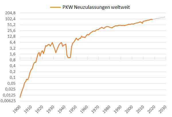 Der Automobilsektor gilt als einer, der seit Jahrzehnten Wachstum gezeigt hat und es auch für die Zukunft verspricht. Gute Ausgangsbedingungen also für die Unternehmen in dieser Branche? Die nachfolgende Grafik zeigt, wo hier leider ein größerer Hase im Pfeffer liegt. Sie gibt die Anzahl der jährlichen, weltweiten PKW-Neuzulassungen von 1900 bis ins Jahr 2030 wider (ab 2019 auf Grundlage einer Schätzung der Unternehmensberatung McKinsey).