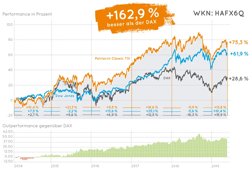 Ein Anleger, der in den letzten fünf Jahren sein Geld in den DAX investiert hat, musste eine Volatilität von über 17 Prozent aushalten und konnte nur eine Performance von 27,01 Prozent erzielen. Die gleiche Anlage in den TSI-Fonds war nur mit einer Volatilität von rund 15 Prozent verbunden und brachte eine Rendite von über 69,47 Prozent.