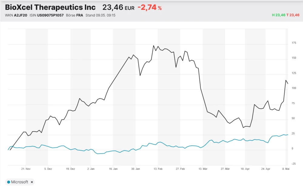 BioXcel hatte am Montag Zahlen für das erste Quartal vorgelegt. Das Unternehmen meldete einen Quartalsumsatz von 206.000 US-Dollar und verfehlte damit die Konsensschätzungen von 500.000 US-Dollar. Die Amerikaner verzeichneten einen Nettoverlust von 52,8 Millionen Dollar, somit belief sich der Verlust je Aktie auf 1,84 Dollar. Die Konsensschätzungen von 1,62 Dollar Verlust je Aktie wurden damit verfehlt.