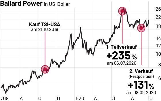 Zuletzt machte das Unternehmen aus Kalifornien durch seine Zusammenarbeit mit Chart Industries in Sachen Onboard-Wasserstofflösungen für die Schwerlastmobilität auf sich aufmerksam (DER AKTIONÄR berichtete). Erstmalig empfohlen wurde BALLARD POWER im Börsendienst übrigens am 21. Oktober 2019. Anfang Juli 2020 erfolgte ein Teilverkauf, der mit +235 Prozent ein absoluter Erfolg war. Auch der Restverkauf im September 2020 konnte sich mit einem Plus von 131 Prozent mehr als sehen lassen.