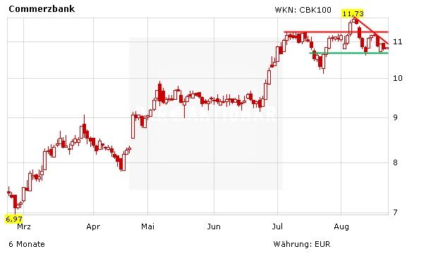 DER AKTIONÄR hält die Commerzbank-Aktie weiterhin für einen Kauf und hat ein Kursziel von 14,00 Euro ausgegeben. Ein Stopp sollte bei 9,00 Euro platziert werden.