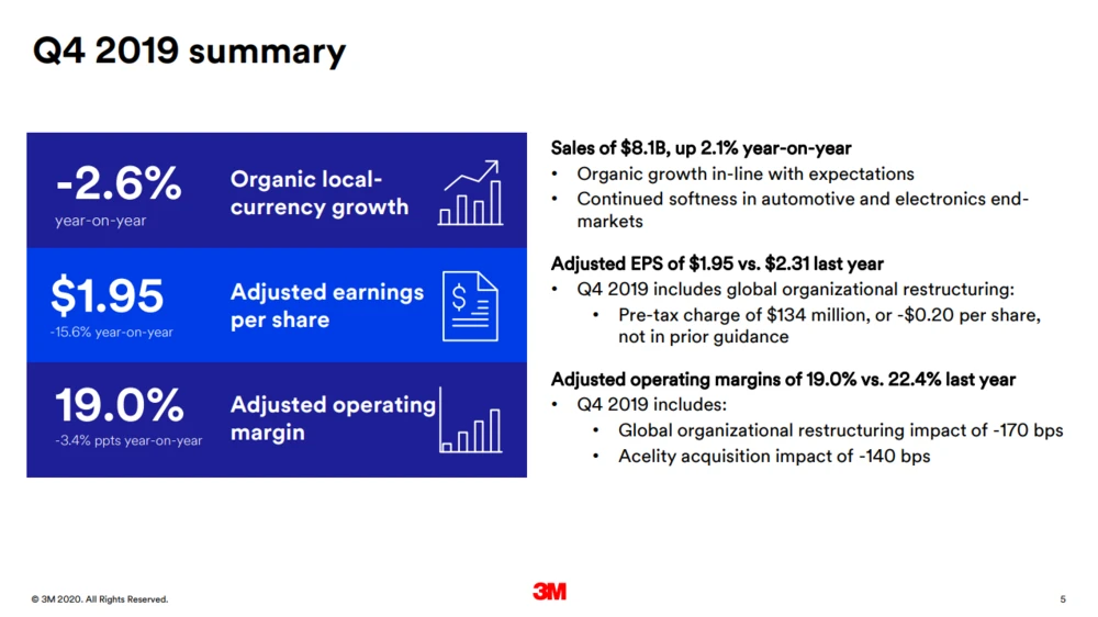 Das für seine Post-its bekannte Unternehmen hat ein echtes Kostenproblem. Obwohl der Umsatz im vierten Quartal von 7,95 auf 8,11 Milliarden Dollar kletterte – was jedoch überwiegend auf Zukäufe zurückzuführen ist – blieben unterm Strich nur 969 Millionen Dollar beim Konzern aus Minnesota hängen. Im Vorjahresquartal konnte man hier noch ein Nettoergebnis von 1,35 Milliarden Dollar vorweisen. Ebenfalls verfehlte man die Erwartungen der Analysten beim Gewinn je Aktie. Diese hatten im Schnitt mit 2,11 Dollar gerechnet. Letzten Endes waren es dann allerdings nur 1,95 Dollar, die der Konzern ausweisen konnte (siehe Grafik unten).