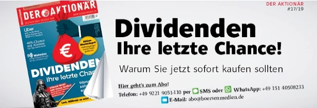 Weitere lukrative Dividendenaktien gibt esin der aktuellen Ausgabe von DER AKTIONÄR, die Sie hier bequem herunterladen können.