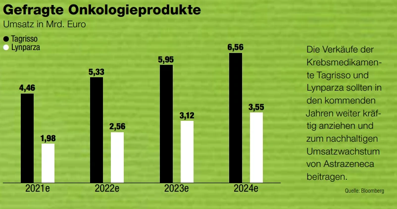 Tagrisso ist eines der umsatzstärksten Medikamente von Astrazeneca. Analysten erwarten im Schnitt für 2021 Produkterlöse hin Höhe von knapp 4,5 Milliarden Euro. 2024 sollen es bereits gut 6,5 Milliarden Euro sein (siehe Grafik). Tagrisso ist mittlerweile in mehr als 50 Ländern, darunter den USA und China, für die Behandlung von Lungenkrebs im Frühstadium zugelassen. Weitere Zulassungsanträge sind derzeit in der Prüfung.