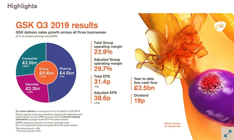 So kletterten die Umsätze im Zeitraum von Juli bis September um 16 Prozent auf 9,4 Milliarden Pfund (rund 10,9 Mrd Euro) beziehungsweise elf Prozent zu konstanten Wechselkursen. Der um Sondereffekte bereinigte Gewinn je Aktie stieg um 9 Prozent auf 38,6 Pence. Dabei liefen die Geschäfte vor allem bei den Impfmitteln wie dem Kassenschlager Shingrix rund, wodurch sich die Probleme beim Asthma-Medikament Advair nicht ganz so stark bemerkbar machten.