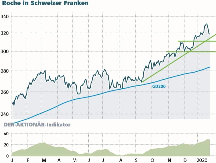 DER AKTIONÄR hatte zuletzt nach der starken Rallye der vergangenen Monate geraten, über Teilgewinnmitnahmen nachzudenken. Anleger, die der Empfehlung gefolgt sind, konnten die jüngste Korrekturbewegung gelassen beobachten. Aber auch alle anderen brauchen nicht in Panik zu verfallen. Die Aktie von Roche bleibt langfristig weiter eine der Branchenfavoriten des AKTIONÄR. Eine erste wichtige Unterstützung wartet im Bereich von 310 Schweizer Franken, die nächste bei 300 Franken. Nicht zu verachten ist Roche außerdem als verlässlicher Dividendenzahler. Derzeit beträgt die Rendite 2,7 Prozent.