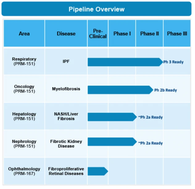 Promedior entwickelt Medikamente zur Behandlung der Lungenkrankheit idiopathische pulmonale Fibrose (IPF). Die Krankheit führt zu einer irreversiblen Einschränkung der Lungenfunktion. Der Produktkandidat PRM-151 hat im laufenden Jahr von der US-Gesundheitsbehörde FDA den Status "Therapiedurchbruch" (Breakthrough Therapy Designation) erhalten. Das Mittel habe in einer Phase-2-Studie eine Verbesserung der Lungenfunktion erreicht. Auch würde der therapeutische Einsatz bei anderen Fibrose-Arten geprüft.