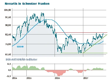 Zuletzt gelang den Schweizern beispielsweise ein absoluter Meilenstein in der modernen Krebsmedizin. In den USA wurde mit Kymriah die erste Krebsimmuntherapie auf Basis von CAR-T-Zellen zugelassen. Zudem hat Novartis von der EU-Kommission die Marktzulassung für sein Leukämie-Medikament Rydapt in zwei verschiedenen Indikationen erhalten. Die erste betrifft die Behandlung neu diagnostizierter akuter myeloider Leukämie (AML) bei erwachsenen Patienten, welche positiv auf eine Kinase-3-Mutation getestet sind, in Kombination mit einer Chemotherapie. Die zweite Indikation gilt für Patienten mit aggressiver systemischer Mastocytose (ASM). Das Präparat ist bereits in den USA und in der Schweiz zugelassen. Und auch die jüngste Ankündigung, dass der langjährige Vorstandsvorsitzende Joseph Jimenez den Konzern Ende Januar 2018 verlassen wird, hat die Aktie gut weggesteckt – ein gutes Zeichen. Sein Nachfolger Vas Narasimhan ist aber auch kein Unbekannter: Er leitete bisher die Entwicklung von Krebsmedikamenten bei den Schweizern. Zudem will der bisherige CEO noch bis Ende des Jahres einen konkreten Plan für die Augenheilkunde-Sparte Alcon vorlegen. Von einem Verkauf über einen Verbleib in der Firma bis zu einem Börsengang ist alles möglich. Alcon ist das Sorgenkind von Novartis: Seit vielen Jahren kommt das Geschäft nicht in Schwung. Für satte 50 Milliarden Dollar kaufte der Pharma-Riese die Sparte 2010 von Nestlé. Eine baldige Entscheidung könnte weitere Unsicherheit aus dem Wert nehmen und die Aktie beflügeln.