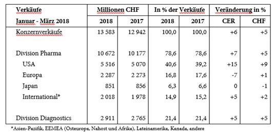 Der Schweizer Pharmakonzern Roche hat die Zahlen für das erste Quartal des laufenden Geschäftsjahres vorgelegt. Die Konzernverkäufe stiegen in den ersten drei Monaten des Jahres zu konstanten Wechselkursen um sechs Prozent auf 13,6 Milliarden Schweizer Franken. In der Division Pharma erhöhte sich der Umsatz bei konstanten Wechselkursen um sieben Prozent auf 10,7 Milliarden Franken, so das Unternehmen. Ein wichtiger Wachstumstreiber war Ocrevus zur Behandlung von zwei Formen der multiplen Sklerose. Dieses Medikament setzte im ersten Quartal sein starkes Wachstum in den USA fort und wurde in Europa und weiteren Ländern auf der ganzen Welt eingeführt. Das anhaltend starke Umsatzwachstum von Perjeta war begünstigt durch die US-Zulassung des Medikaments zur postoperativen Behandlung von HER2-positivem Brustkrebs im Frühstadium bei Patientinnen mit hohem Rückfallrisiko, heißt es in der Mitteilung. Zum Ende des ersten Quartals war diese zusätzliche Indikation für Perjeta in zehn Ländern zugelassen. Weiter Umsatz verloren hat dagegen das Blutkrebsmedikament Rituxan wegen der neuen Generikakonkurrenz in Europa.