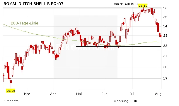 Die Aktie von Royal Dutch Shell ist zuletzt ordentlich unter Druck geraten, nachdem die Zahlen zum zweiten Quartal enttäuscht hatten. Die niedrigen Ölpreise haben den Ölkonzern stark belastet. Unter dem Strich verdiente der britisch-niederländische Konzern 1,175 Milliarden Dollar und damit gut 70 Prozent weniger als ein Jahr zuvor. Der für die Analysten wichtige bereinigte Gewinn zu Wiederbeschaffungskosten sackte um 72 Prozent auf 1,045 Milliarden Dollar ab. Das war nur etwa halb so viel wie von Analysten erwartet. Alle Ölkonzerne stehen derzeit wegen des Ölpreisverfalls unter Druck.