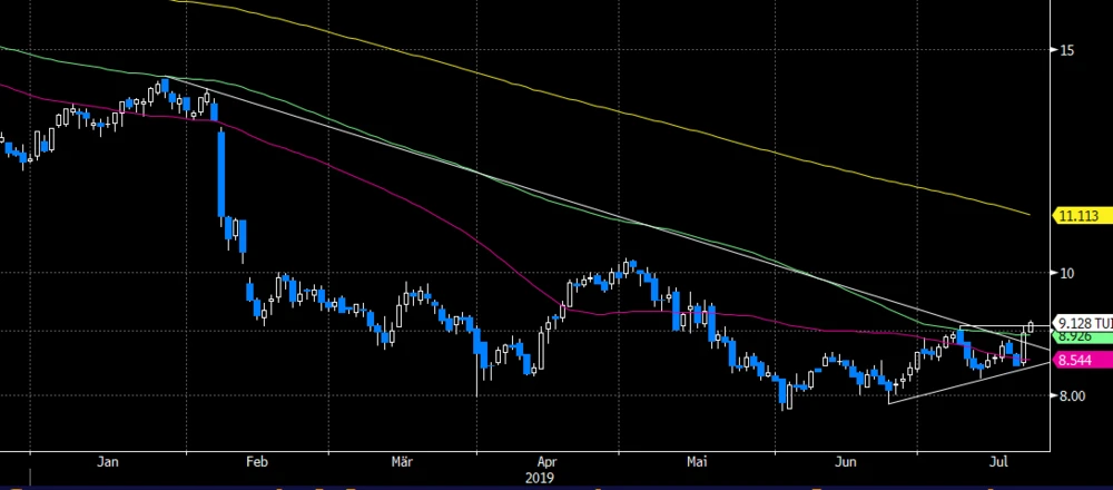 Wohl auch vor diesem Hintergrund haben die Analysten von Stifel die TUI-Papiere in ihrer Ersteinstufung mit „Buy“ eingestuft. Diese Meldung dürfte dem Kurs heute weiteren Rückenwind verleihen. Nun ist der TUI-Aktie auch der Sprung über das Zwischenhoch bei 9,08 Euro geglückt. Somit wäre theoretisch der Weg nach oben bis zur Marke von 10,27 Euro frei.