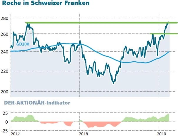 Die Aktie des Schweizer Pharmakonzerns Roche ist derzeit nicht zu bremsen. Seit Juni vergangenen Jahres kennt das Papier nahezu nur eine Richtung: die nach oben. Zuletzt gelang der Aktie sogar der Sprung auf ein neues 3-Jahreshoch. Und auch das Allzeithoch aus dem Jahre 2014 ist nicht mehr weit entfernt. Die Rekordmarke liegt bei 295,80 Schweizer Franken. Beflügelt wurde die Aktie zuletzt unter auch von einem starken Jahresergebnis 2018. Hier stiegen die Konzernverkäufe zu konstanten Wechselkursen um sieben Prozent auf 56,8 Milliarden Schweizer Franken. Die wichtigsten Wachstumstreiber waren in der Division Pharma das neue Medikament Ocrevus zur Behandlung von zwei Formen der multiplen Sklerose sowie die Krebsmedikamente Perjeta, Tecentriq und Alecensa. Mit Verkäufen von 2,4 Milliarden Franken im ersten vollständigen Geschäftsjahr ist Ocrevus die bislang erfolgreichste Produkteinführung in der Geschichte von Roche, so der Konzern. In der Division Diagnostik konnte vor allem der Bereich Immundiagnostik überzeugen. Der Kerngewinn je Aktie stieg um 19 Prozent auf 18,14 Schweizer Franken. Gleichzeitig kündigte Roche eine Erhöhung der Dividende von 8,30 Franken im Vorjahr auf 8,70 Franken je Anteilschein an. Dies entspricht beim derzeitigen Kurs einer Dividendenrendite von 3,2 Prozent. Gleichzeitig zeigte sich Roche zuversichtlich, auch im laufenden Jahr weiter zu wachsen. Der Ausblick fiel deutlich besser aus als vom Gros der Analysten erwartet.