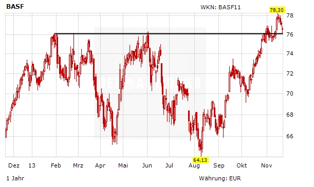 Die Commerzbank hat die Einstufung für BASF auf "Buy" mit einem Kursziel von 85 Euro belassen. Die Gewinndynamik europäischer Chemieunternehmen dürfte sich 2014 beschleunigen, schrieb Analyst Lutz Grüten in seiner aktuellen Branchenstudie. Die Konzerne sollten vom Absatzwachstum in den Schwellenländern sowie von weiteren positiven Effekten durch Restrukturierungen und Kostensenkungen profitieren. BASF sei ein "Top Pick" im Sektor.