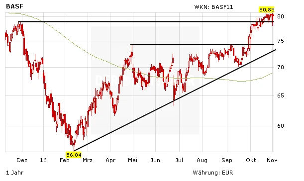 Auch die Aktie des Ludwigshafener Chemieriesen BASF hat sich im gestrigen Handel relativ rasch vom Trump-Schock erholt. Auch im frühen Handel präsentiert sich der DAX-Titel in robuster Verfassung. Geht es nach den Experten der Deutschen Bank, so haben die Anteilscheine des Weltmarktführers ohnehin noch Luft nach oben.