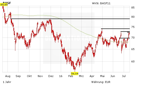 Zunächst gilt es, das Hoch vom Donnerstag bei 72,40 Euro zu überwinden und danach das Zwischenhoch bei 72,60 Euro. Danach hätte der DAX-Titel zunächst Luft bis etwa 75 Euro. Wird auch dieser Widerstand übersprungen, so könnte die BASF-Aktie bis auf 79 Euro klettern.