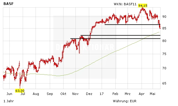 Die Korrektur an den Märkten setzt sich fort. Dabei ist auch die Aktie von BASF deutlich unter Druck geraten. Ausgehend vom Hoch von Anfang April bei 94,32 Euro hat der DAX-Titel bereits mehr als zehn Prozent verloren (wobei hier auch 3,00 Euro Dividendenabschlag zu berücksichtigen sind). Wie sollten Anleger jetzt reagieren?