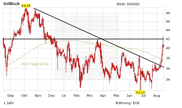 Um mehr Kunden für die Nutzung des Netzes von Telefonica Deutschland zu generieren, verzichtet Drillisch derzeit auf Geld. An der Börse kommt die Strategie gut an. Mit einem Plus von über 25 Prozent innerhalb von einem Monat hat die Aktie die Gunst der Anleger zurückgewonnen. Der Abwärtstrend und die 200-Tage-Linie wurden bereits überwunden. Gelingt nun der nachhaltige Sprung über die 42-Euro-Marke, wäre der Weg nach oben frei.