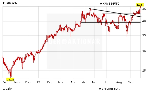 Das ohnehin ansprechende Chartbild bei Drillisch hat sich am Freitag noch einmal verbessert. Seit dem Bruch der 200-Tage-Linie im August – eigentlich ein Verkaufssignal – marschiert der Kurs stetig nach oben. Der Aufwärtstrend bleibt entsprechend intakt. Mit dem Sprung über das alte Rekordhoch aus dem Mai wäre der Weg nach oben nun frei. Nach unten sichern die ehemaligen Widerstände bei 43 und rund 40 Euro ab.