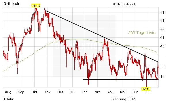 Charttechnisch hat sich das Bild bei Drillisch etwas aufgehellt. Langfristig stimmen die Aussichten nach wie vor. Anleger bleiben vorerst an Bord. Der Stoppkurs bei 31 Euro ist wieder deutlicher entfernt. Für Drillisch spricht zudem die attraktive Dividendenrendite von gut fünf Prozent.