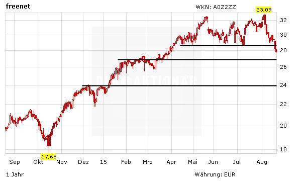 In den vergangenen Tagen ist die Freenet-Aktie im schwachen Marktumfeld deutlich unter Druck geraten. Seit dem Rekordhoch nach der Veröffentlichung der Zahlen zum zweiten Quartal hat der TecDAX-Titel bereits rund 15 Prozent verloren. Charttechnisch spitzt sich die Lage nun zu. Die Unterstützung bei rund 28,50 Euro ist bereits gebrochen.