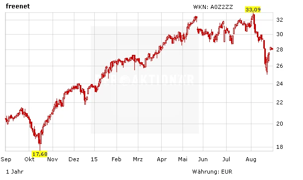 Auch die Privatbank Hauck & Aufhäuser hat sich zuletzt optimistisch präsentiert. Die Experten haben das Kursziel zwar auf 30 Euro belassen, die Freenet-Aktie aber von "Hold" auf "Buy" hochgestuft. Vor dem Hintergrund der hundertprozentigen Ausrichtung auf den deutschen Verbraucher in Verbindung mit einem abonnentenbasierten, gut vorhersehbaren Geschäftsmodell erscheine der jüngste Kursrückgang im Zuge der allgemeinen Marktturbulenzen nicht gerechtfertigt, erklärte Analyst Leonhard Bayer in der vergangenen Woche. Die Aktie des Mobilfunkproviders sei wieder attraktiv bewertet.