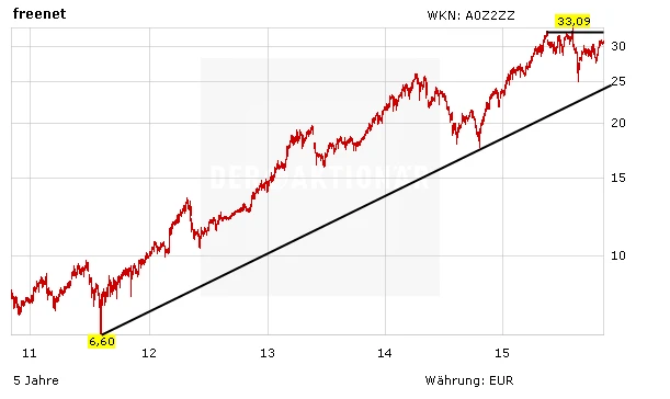 Die Freenet-Aktie notiert knapp unterhalb des Mehrjahreshochs. Gelingt der Ausbruch, wäre der Weg nach oben frei. Auch die attraktive Dividende spricht für den Titel. Im Mobilfunksektor ist der Konkurrent Drillisch derzeit aber dennoch besser aufgestellt. DER AKTIONÄR empfiehlt deshalb weiter ein Investment beim Rivalen, der nach starken Zahlen ebenfalls ein neues Rekordhoch anpeilt.
