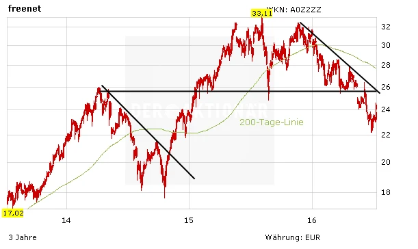 Charttechnisch ist das Bild bei Freenet trotz der leichten Erholung noch eingetrübt. Der mittelfristige Abwärtstrend ist nach wie vor intakt. Dieser verläuft derzeit bei etwa 25,50 Euro. Erst oberhalb dieser Marke würde sich die Situation aufhellen. Knapp oberhalb wartet dann der horizontale Widerstand bei 25,80 Euro. Gelingt auch der Sprung über diese Hürde, wäre die Trendwende geschafft. Dann könnte es zu einem ähnlichen Szenario wie 2014 kommen als auf deutliche Verluste eine Mega-Rallye folgte.