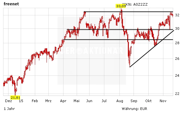 Seit Wochen notiert die Aktie von Freenet knapp unterhalb des Mehrjahreshochs bei 33,09 Euro. Der Ausbruch über diese Marke mag dem TecDAX-Konzern derzeit aber nicht gelingen. Vielmehr hängt der Mobilfunkanbieter nach der jahrelangen Rallye derzeit im Seitwärtstrend fest.