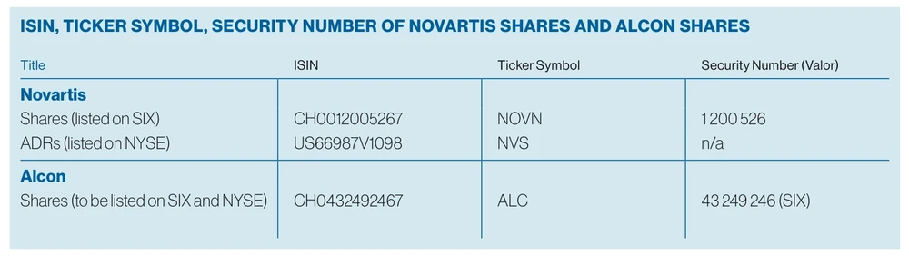 Alcon soll in Form einer Ausschüttung per Sachdividende an die bisherigen Aktionäre abgetrennt werden. Für je fünf Novartis-Aktien erhalten die Anteilseigner eine Aktie von der Augenheilkunde-Division (gleiches gilt für die American Depositary Receipts, ADRs).