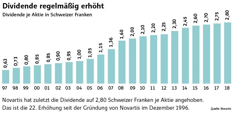 Ganz nebenbei ist der Konzern aber auch noch ein starker Dividendenzahler. Seit der Gründung im Jahr 1996 hat Novartis jedes Jahr die Dividende angehoben. Und auch bei der nächsten Dividendenzahlung dürfte es mehr geben. Voraussichtlich 2,95 Schweizer Franken je Aktie werden ausgeschüttet, das entspricht einer satten Rendite von 3,4 Prozent.