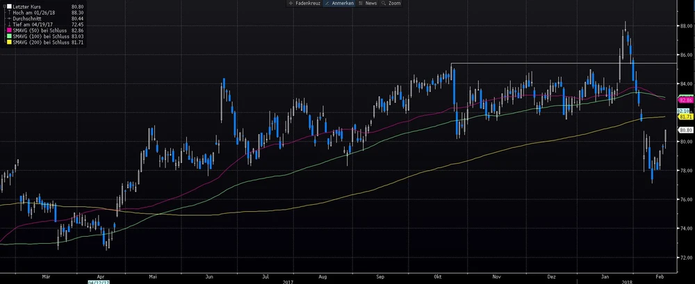 Im schwachen Gesamtmarkt ist auch die Novartis-Aktie unter die Räder gekommen. Das Update zu Cosentyx und der anstehende Sparten-Verkauf der Nachahmer-Pillen sind klar positiv zu werten. Wichtig ist nun, schnell die 200-Tage-Linie zurückzuerobern. Im Anschluss wäre der Weg in Richtung 85,50 Franken frei. Gelingt der Sprung über diesen horizontalen Widerstand, rückt das 52-Wochen-Hoch wieder in den Fokus der Anleger.