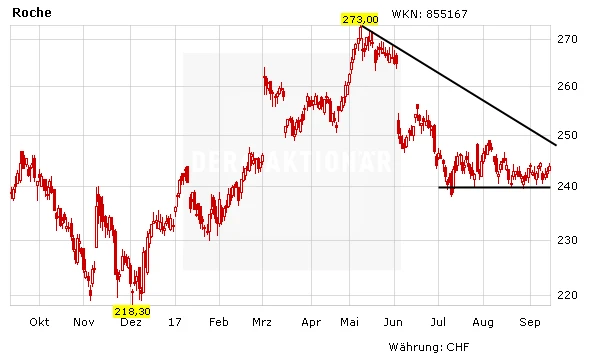 Die zuletzt negativen Nachrichten gingen auch an der Roche-Aktie nicht spurlos vorbei. Seit Juni befindet sich das Papier im Abwärtstrend und sucht bislang nach einem Boden. Investierte Anleger sollten sich dennoch nicht aus der Ruhe bringen lassen. Langfristig ist der Roche-Konzern gut aufgestellt. On top belohnt Roche seine Aktionäre stets mit hohen Dividendenzahlungen. Ein Neueinstieg drängt sich aufgrund der charttechnischen Verfassung nicht auf.