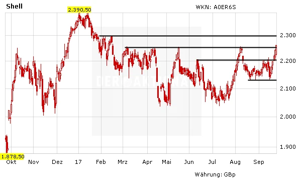 Denn im gestrigen Handel ist der Kurs von Shell über den Widerstand bei 2.256 Britische Pence geklettert. Kann sich die Aktie nun nachhaltig über dieser Marke halten, dürfte es anschließend in Richtung der nächsten Hürden bei 2.300 und das Jahreshoch bei 2.390,50 Pence nach oben gehen. Kann die Marke von 2.256 Pence hingegen doch nicht gehalten werden, sichern nach unten die Unterstützungen im Bereich von 2.200 sowie 2.130 Pence ab.