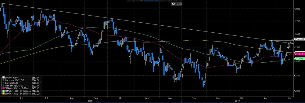 Nachdem in der Vorwoche der Ausbruch aus dem langfristigen Abwärtstrend geglückt ist, konnte nun auch der horizontale Widerstand bei 2.551 Britischen Pence geknackt werden. Nun wäre der Weg nach oben vorerst frei.